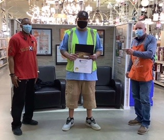 Andre Galloway was nominated for a Bravo Award by Assistant Store Manager Lisa Gregory. Andre Galloway has improved the store and has gone above and beyond in keeping the standards up, restrooms clean, and floors scrubbed. Area Manager William Washington (standing to the left) and Store Manager Kevin Sidle (standing to the right) presented Andre with his award certificate.