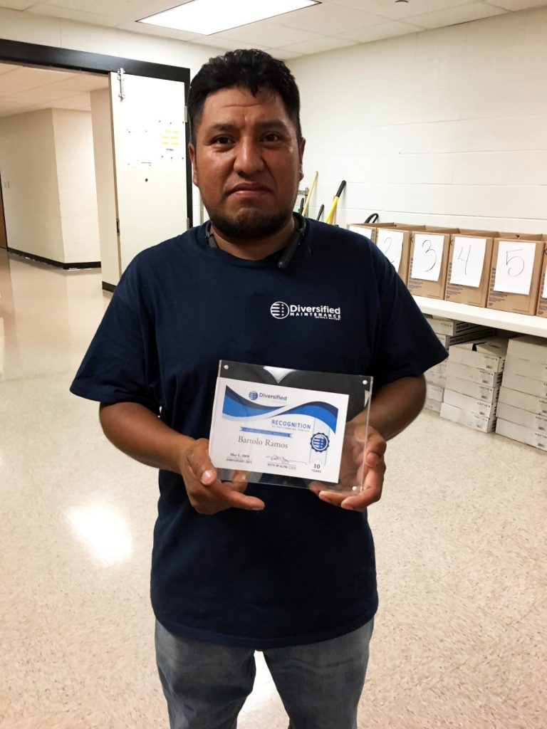 Bartolo Ramos and Vicente Ayala, at the RSA Tower in Montgomery, each recently received their 10 year service awards! Vicente, pictured below right, has the unique privilege of cleaning and maintaining two floors within this account. These two floors are of great concern to all of us because this is where the RSA CEO and many other RSA dignitaries maintain their offices and hang their hats at work. Louise Knight, our Project Manager, tells us that Vicente does an excellent job in maintaining these areas and that we all appreciate his expertise in his work ethics, and professional attitude.