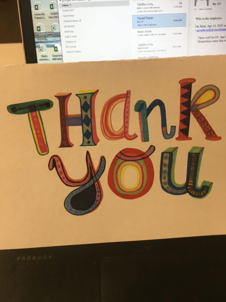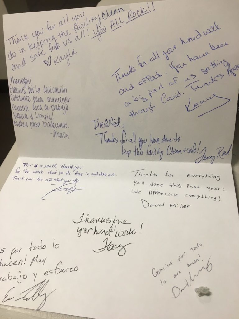 The management of Lowe’s RDC in Mt. Vernon recently provided lunch for our team to say thanks for keeping their staff safe during the covid situation. Along with the lunch, Lowe’s gave our team a Thank You card along with personalized messages for individual team members. In the center of the card is a message from Kenny Dickerson our contact at the site.
