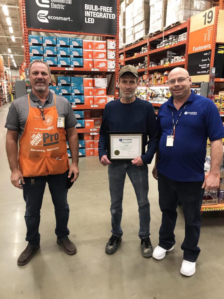 Jim Jeffries was recently presented a Bravo Award at Home Depot 4126 for his oustanding performance, as well as his excellent attendance record. The award was presented by John Lynn and the Home Depot manager on duty, Doug Copeland. Congratulations, Jim, and thank you for all your hard work!