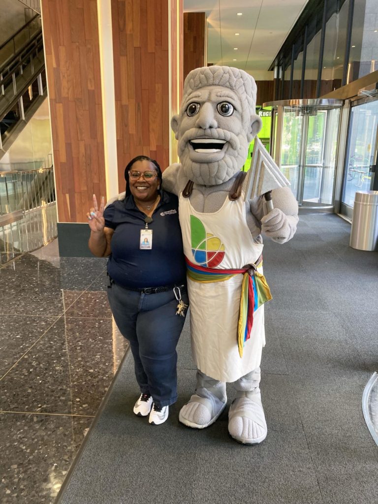 Lafeathura Williams recently had the opportunity to meet the Vulcan mascot for the 2022 World Games hosted in Birmingham, Alabama. Vulcan stopped by the Regions Center downtown, where Lafeathura happens to be on the Diversified crew responsible for maintaining the building. Very cool, Lafeathura! For anyone interested in the World Games, happening now in Birmingham, click here for more information.
