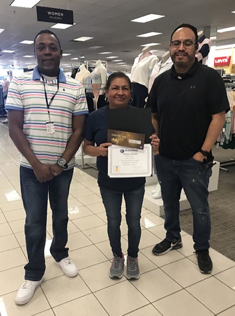 Maria Cuellar recently received a Bravo Award for her amazing work at Kohl’s. She is always very attentive to keeping her store clean, and the Kohl’s staff certainly appreciates all her hard work. Maria is pictured below receiving her Bravo Award from Area Manager Cedric and Carlos Rodriguez. Thank you Maria, and congratulations!